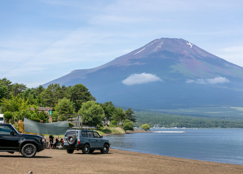 受付を済ませたら、いよいよ1日1組限定の貸し切り湖畔サイトへ。湖に面した広々とした区画は、どこにテントを張っても富士山と山中湖を望める開放的なロケーションです。地面はやや起伏があるため、設営場所は慎重に選びたいところ。また、サイトの奥側や湖畔側は地面が緩いため、車で入る場合は4WDが安心です。2WDでも手前に停めれば問題ありません。