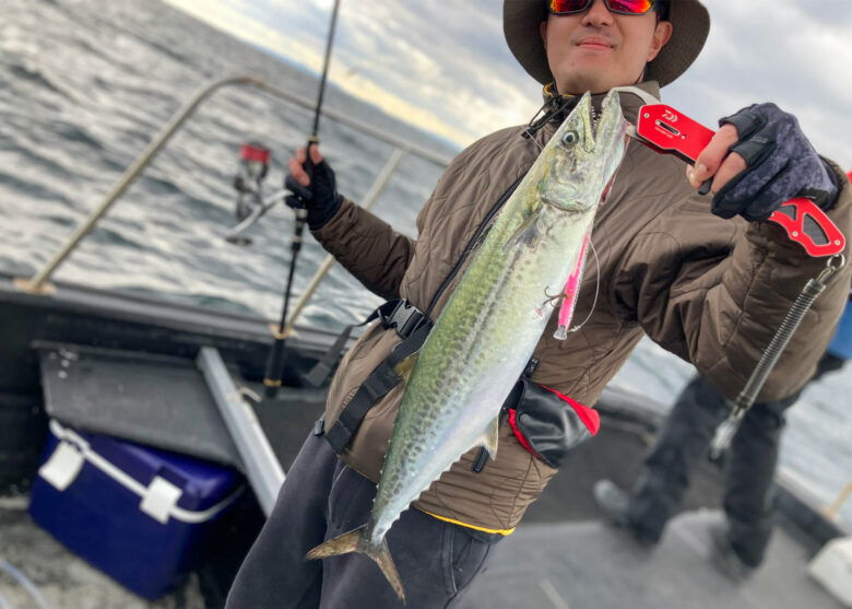 朝マズメのあとは食いが収まり、ボトム付近に群れの反応が出ました。ポイントの水深は27mと少し深いのでブレードを選択。陽光が照り付ける晴天だったこともあり、フラッシングでアピールすることにし、シルバーカラーでカウント15から巻き上げるとヒット! 60cmのサゴシをキャッチすることができました。