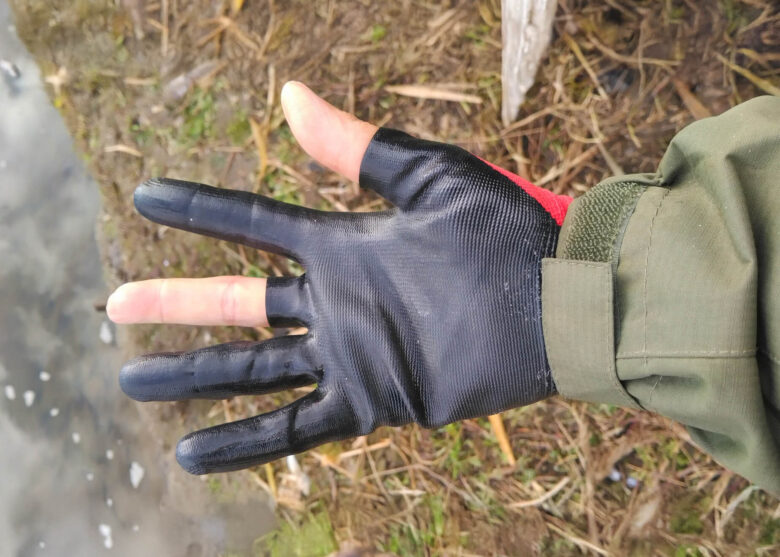 市販のフィッシンググローブと違い、畳んでコンパクトにできるため、ポケットなどに手軽に忍ばせておけます。また、フィッシンググローブとフィンガーガードの機能が一体化しているので、それぞれを別々に用意する必要もありません。さらに、掌や指の裏側に施されたゴムやシリコンの滑り止め加工によってグリップ力も高く、この点では市販のものより優れているかもしれません(笑)。