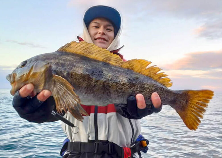 根掛かりしないようにロッドから伝わるボトムの感触を感じつつ、ゆったりとしたリフト&フォールでアクションしていくと、リフト中に根掛かりのような感触が…。「やってしまった…」と思いつつ少しだけ竿先にテンションをかけてみると、「カンッ!」という明らかに魚がバイトした衝撃が手元に伝わってきました! とくに起伏の激しいポイントに差しかかっていたので、根に潜られないようパワーファイト! 苦手なボトムの釣りで、無事アイナメをキャッチすることができました!