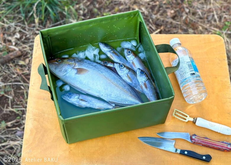 南房総・鴨川で獲れた「クロムツ」と「ショッコ(汐子、カンパチ幼魚)」を入れてみました。ショッコは全長35cm、魚体を斜めにすれば余裕で入りました。