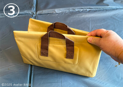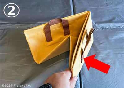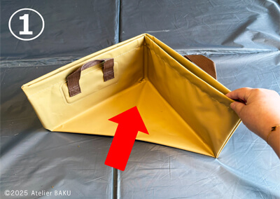 - ①底面の角を内側に向かって裏返し、対角に合わせる