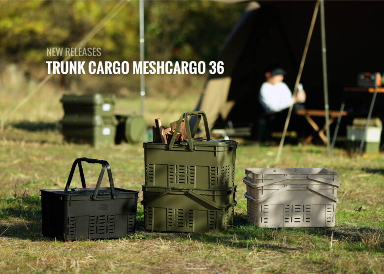 「メッシュカーゴ36」は、大容量でも片手で持ち運べる利便性と、効率的な仕分け収納を兼ね備えた新しいアウトドア収納容器です。キャンプや釣り、日常のさまざまなシーンで活躍します。