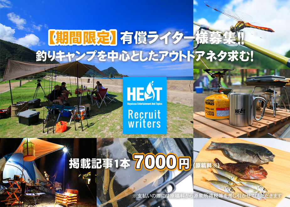 【有償ライターさん募集!】釣りキャンプを中心としたアウトドアに関する記事を書いてみませんか? 2026.3.10 ツイート 釣り&アウトドアスタイルマガジン「HEAT」では、「キャンプ・BBQを中心としたアウトドア」に関する記事を執筆してくださる有償ライターさんを期間限定で募集いたします。 ご興味のある方、素敵な記事を編集スタッフと一緒に作りませんか? 応募期間: 2026年 3月10日(火) ~ 2026年 3月31日(火) 詳しくは下記ページをご確認ください。 「WEBマガジンHEAT 有償ライター様募集のご案内」