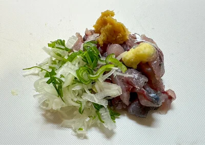 ヘダイとアジの刺身も合わせて、なめろうの出来上がり!