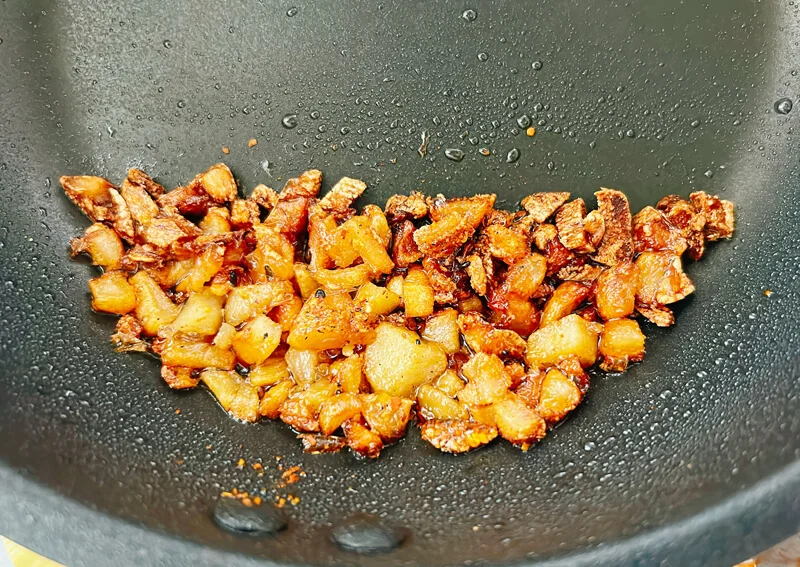 - ①ごま油でニンニクスライスをカリカリに炒めます