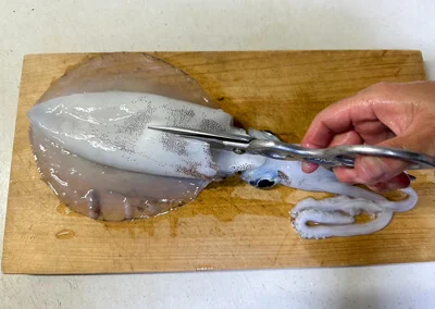 まず、頭の上の胴の部分にハサミや包丁を入れ、こちらからイカを開いていきます。そして開いたら、ハラワタや目を取り除きます。