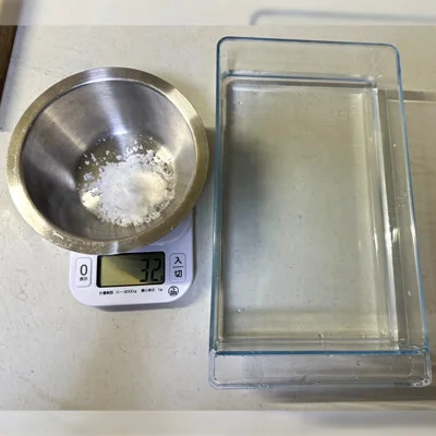 次に、水1Lと塩30gから35gくらいを混ぜ、塩水を作ります。塩水にイカを15分浸けましょう。