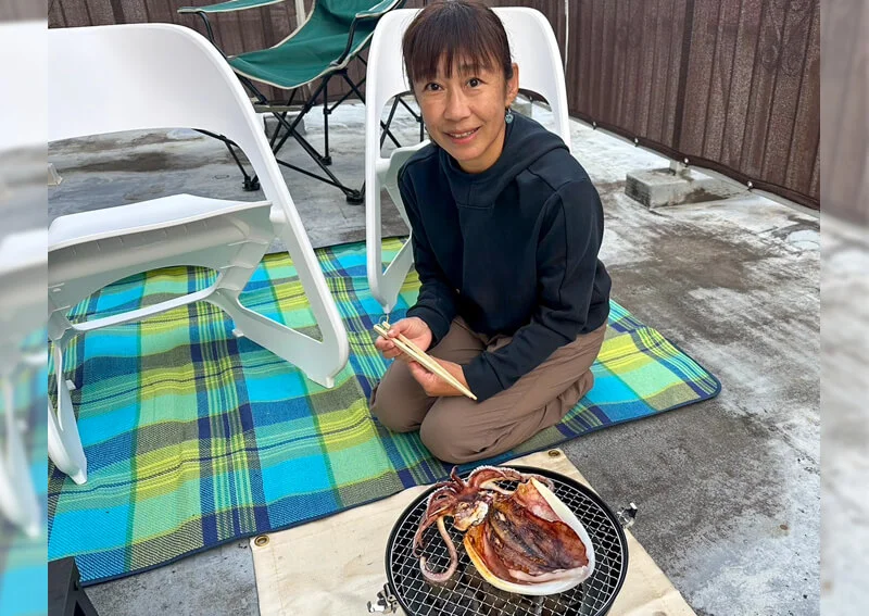 このイカをベランダにて炭で焼いて食べる! この炭の香ばしさと心地よい青空…、贅沢で非日常な時間です。とても柔らかく美味しいイカ焼きができて最高でした!