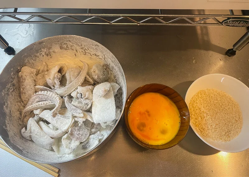 とても美味しい「イカのカツレツ」ですが、難点としては油がはねると後処理が大変なこと。そんな心配があるときは、私は1度軽くボイルします。そして、少し冷蔵庫で寝かせて水分を取ったあと、しっかり薄力粉をまぶして揚げることで、油のはねが格段に減ります。