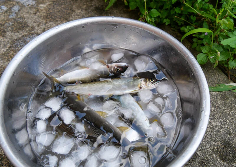 アユの香りをパスタにもしっかりと残したいので、新鮮なうちに氷水で締めていきます。ところが…いざ締めようと取り出すと、アユが大暴れ(汗)。なんとかアユの動きを止めつつ、締めることに成功しました。