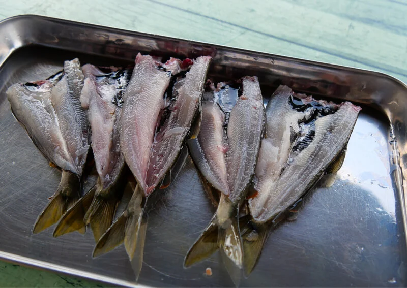 さて、さっそくアユを下処理していきます。藻類を食べるアユは、昆虫や川虫を食べるアマゴやイワナなどの渓流魚とは違い、腹ワタを出す必要がありません。釣ったあとの下処理が少ない魚としても知られていますが、今回はパスタ用ということで背開きにしていきました。