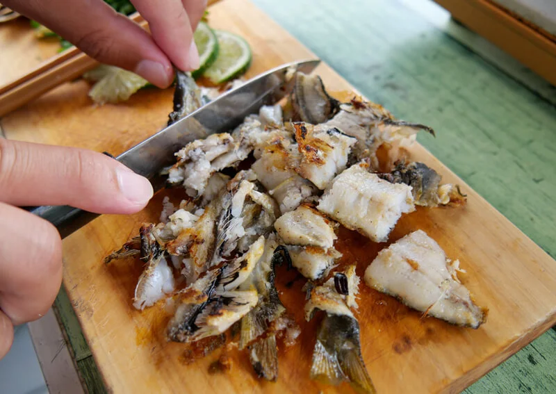 アユが焼けたところで形がギリギリ残っているものはトッピング用に確保、それ以外は和える用にざっくりときざみます。今回はアユも小さく骨まで食べられそうだったので、そのまま一緒にざく切りにしました。