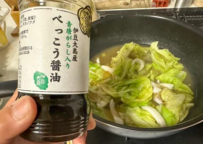 鶏がらスープにキャベツとイカの端くれを合わせフライパンへ。1分ほどで火が通ります。そのあと、べっこう醤油をひと回しし、茹でたパスタを入れるだけ!
