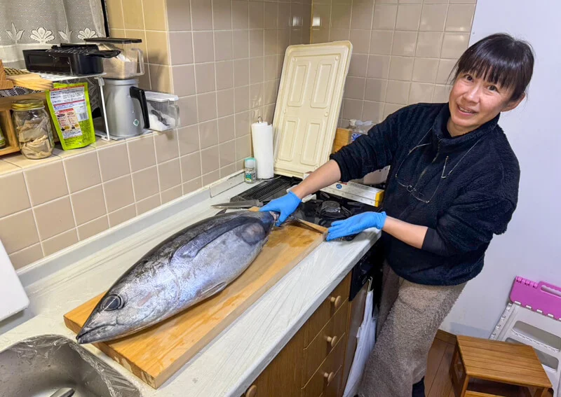 今回、嬉しいゲストとして釣れたビンチョウマグロは、70cmのまな板からはみ出す大物でした!