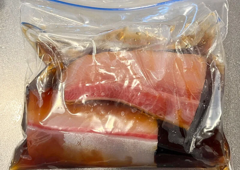 ジッパー付き保存袋に入れた刺身に漬けダレを入れ冷蔵庫へ。そのまま1日寝かせました。