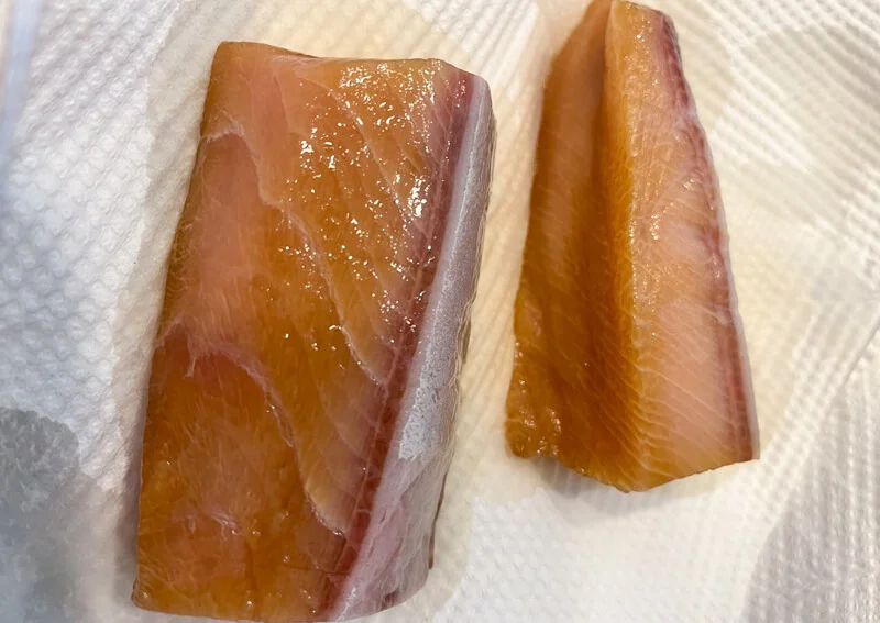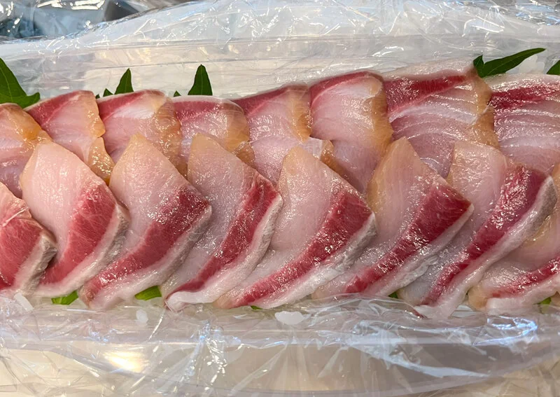 ブリといえば玄界灘!! 釣り上げた天然モノも最高ですが…、九州の養殖ブリも最高です。お店に並んでいたブリの柵は背側や腹側などと選べたので、今回は腹側の脂が乗った部位を購入。この時点では、まだどんなお料理にするか決まっていなかったので、まずはお刺身にして味見してみました。