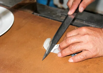 このときは刺身にしてくれたのだが、そのさばき方が何とも独特…。ウロコは取らずにいきなり3枚おろしにして、身を短冊状に切り分けて水分をしっかり水分を取る。腹骨を取ったあとは刺身包丁で皮から身を削ぐように切り離して、そのまま皿に盛り付けるのだ。