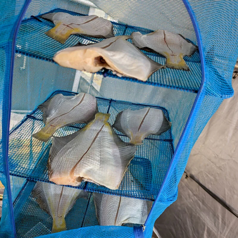 そして、飽和塩水に約1時間浸け込み、カレイの水気をしっかりキッチンペーパーでふき取とったら、干し網に入れ干すだけ!