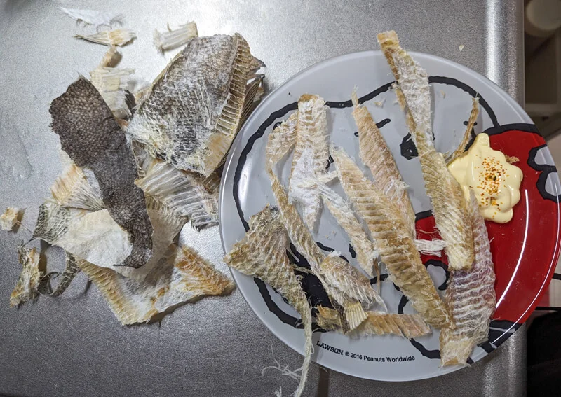 ただ、ひじょうに身をむきづらく、皮をはがすのは少々困難でした。市販されているむき済みのカレイ珍味が高額なのも納得できました。何枚かむいているとコツがつかめてきたものの、中骨が手に刺さってケガをしそうになりましたので、トライされる方はお気を付けください。
