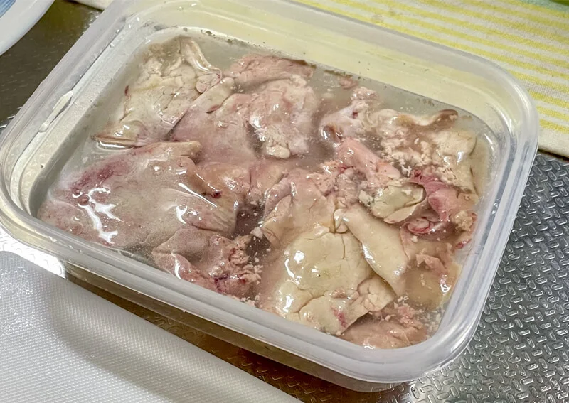 それでも、どうしても細かい血管などが残ることがありますが、お酒を入れた塩水に取り出した肝を2~3時間浸けて冷蔵庫で置いておくことで、浸透圧の働きにより血液を排出することができます。しかし、あまり長時間浸けておくと、逆に苦みが出てくるそうなのでご注意ください。