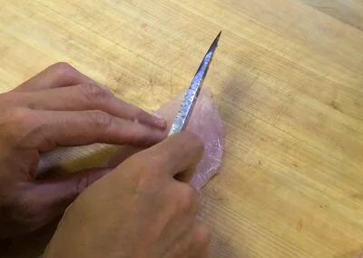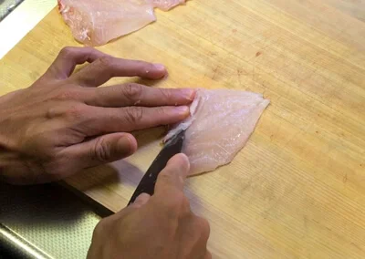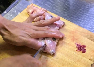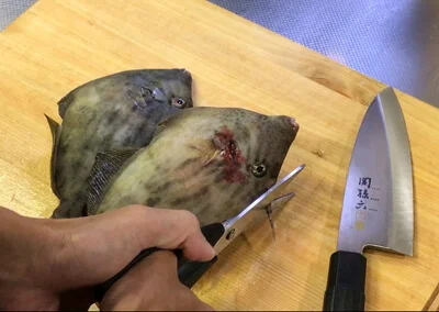カワハギのツノを外します。そして、頭の後ろから背骨まで切れ込みを入れます。