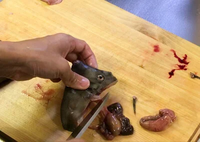 肝と内臓を分けて取り出します。余った頭はエラと皮をはいでおきます。