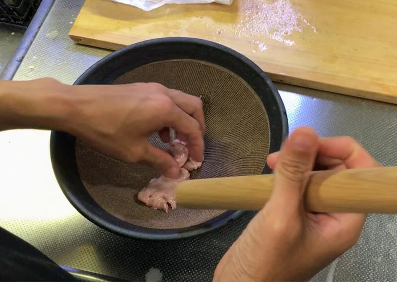 肝を塩水で洗います。すり下ろして血管を取り除きましょう。そして、醤油と混ぜれば「肝醤油」の完成です。
