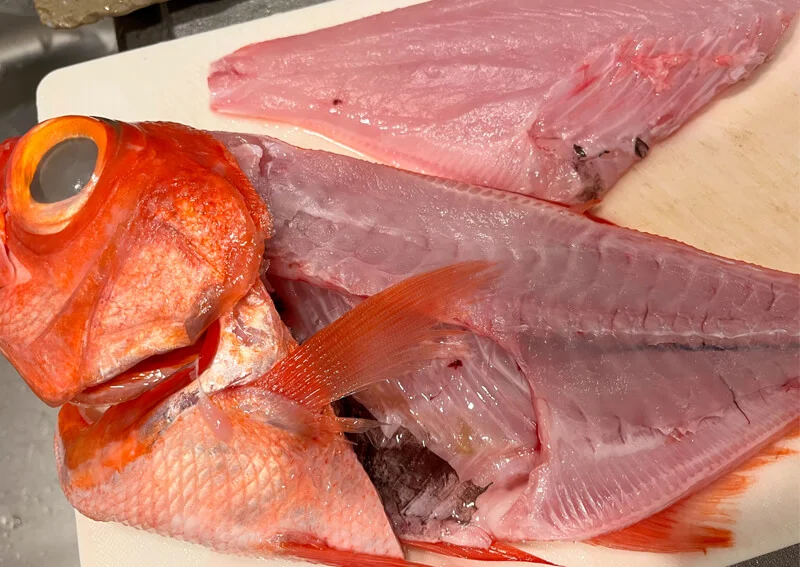 キンメダイはウロコを取り、内臓を取り除いたら料理に合わせてさばいていきます。今回はお刺身、煮付け、タイ飯、天ぷら用に切り分けました。料理に合わせて部位を選びつつ、余すことなく切り分けたので解説はのちほど。