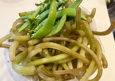 スナップエンドウの花は土や虫など残らぬよう、それぞれよく洗い、筋や無駄な葉を取り除いたりしたあと、お料理ごとに、下茹でしたものとそのまま使うものとで分けておきました。