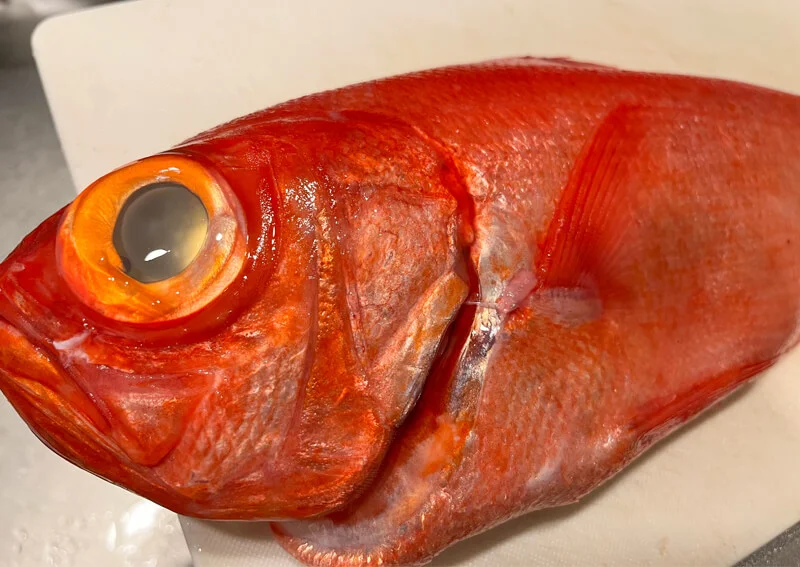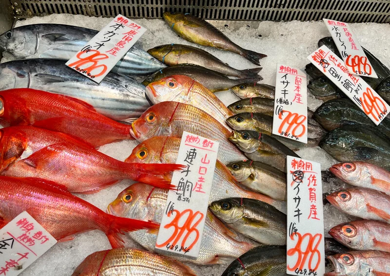 魚屋さんにはイサキ、クロ(メジナ)、ブリ、レンコダイなどいろんな魚が並んでいました。内心、お目当てはサクラダイだったのですが、残念ながら並んでおらず…。それならば「九州ではなかなか釣れない魚にしよう!」と考え、メインの魚は千葉産のキンメダイにすることにしました。