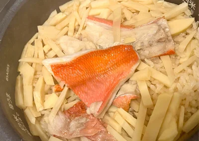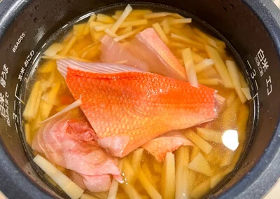 次は「キンメダイと筍のタイ飯」を。家庭調理なので、炊飯器にお世話になり仕込んでいきます! かんたんで他魚にも応用できますので、釣魚料理の参考になればと思います♪