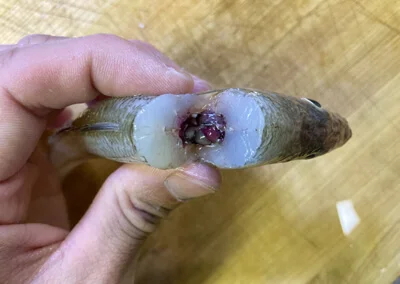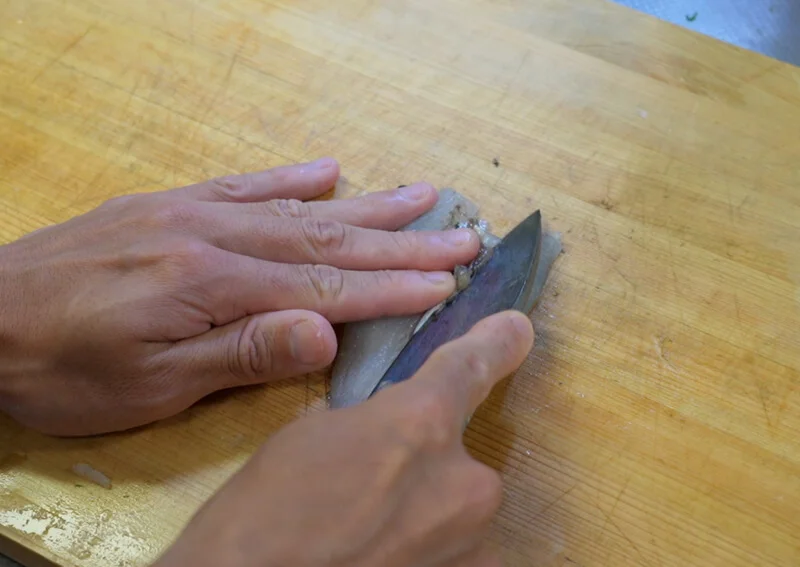 (2)頭から内臓まで切れ込みを入れる(背骨を断ち切る)。