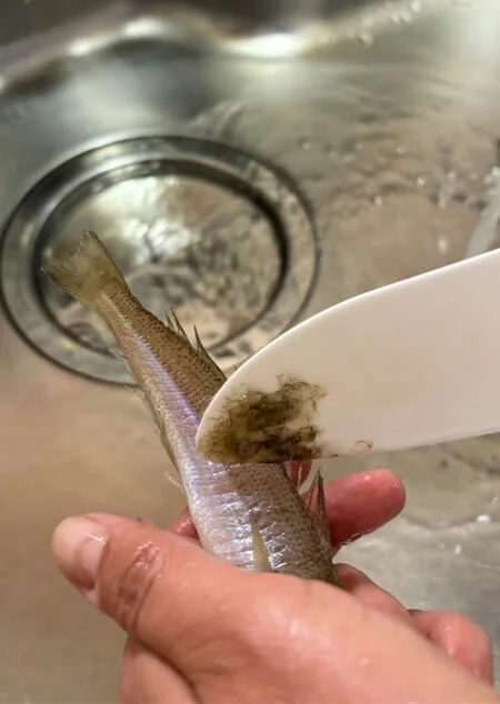 キスはウロコがたくさんあるので、丁寧にウロコを取り除きます。包丁で優しくなでると、たくさんウロコが取れました。娘も初のウロコ取りに挑戦! ペットボトルキャップで取るのが危なくないし、かんたんにウロコ取りができると聞いたことがあったのでやってみたかったのですが、キャップがなかったので次に持ち越しです!