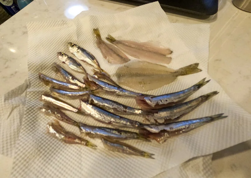 まずはカタクチイワシから。ウロコをさっとこすり落として、指先で腹を割き内臓を丁寧に取り除きます。豆アジとキスも、包丁の先でちまちまと内臓をかき出していく地味な作業…。でも、こういうのも釣りの楽しみの一部ですよね。