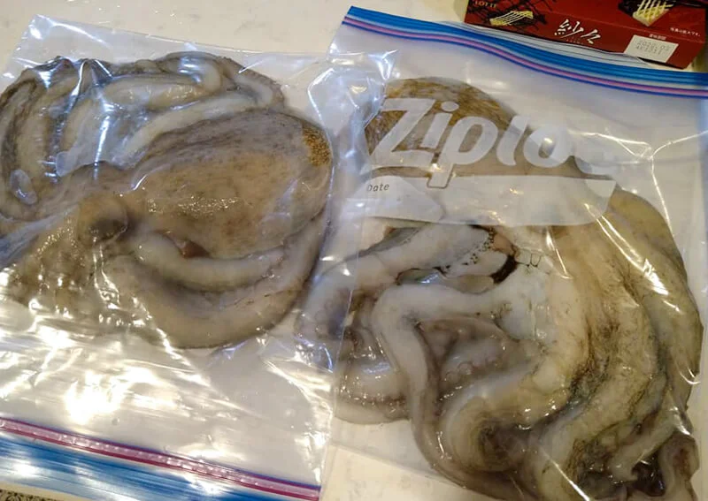 釣ったマダコは、そのまま冷凍保存ができるのも嬉しいポイントです。ヌメリを取ってから冷凍するのもよいですし、釣ってすぐのヌメリや墨が付いたままでも冷凍保存が可能です。むしろ、墨が付いたままの方が「保存液代わり」になるという説もあるくらいで、私もすぐに食べないときはあえて洗わず、そのまま冷凍しています。