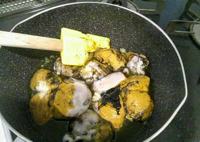 今回は茹でたタコの身とマッシュルームを入れてみました。味付けはシンプルにオリーブオイルとニンニク、塩コショウだけ。ちなみにタコの肝には墨袋がくっ付いていて、これも一緒に調理しちゃいます。だから出来上がりは真っ黒! 見た目はアレですが…イカ墨と同様にタコ墨にも旨味成分がたっぷり含まれているので、これがまた美味しいんです。