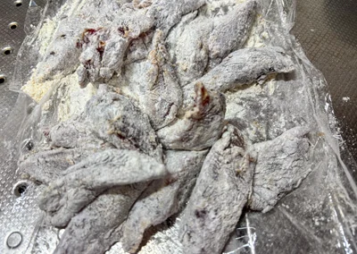 十分味が染み込んだら、サランラップを下に敷いて“粉”をまぶします。サランラップを使うと後片付けがとっても楽ですよ。ちなみに、私が竜田揚げに使用する“粉”は米粉で、油の吸収率が低く衣がカリッとした仕上がりになるのでヘルシーです。