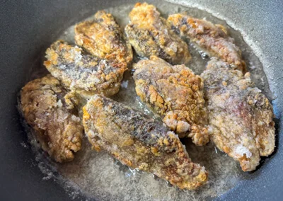 油はサラダ油を使います。180℃になったら片面3分くらいを目安に、キツネ色になるまでコンガリと揚げて裏返します。あまり油は使わず揚げ焼きのように火を通していくと、カリッとなって油の節約にもなりますよ。