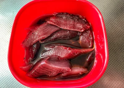 下処理して3枚におろした切り身を、一口大に切ってタレに漬け込みます。タレの分量は「みりん1:酒1:醤油1」の割合で作り、味見して甘くしたかったらみりんを足し、しょっぱくしたかったら醤油を足して味を調整、整ったら30分ほど冷蔵庫で漬け込みます。