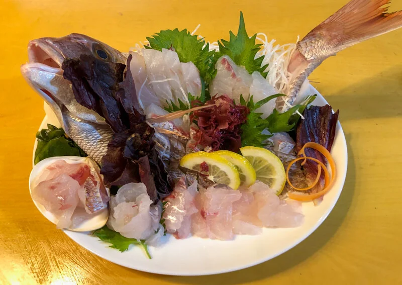 また、アジと比べて取れる身の量も多いので、盛り付けるときも「そぎ切り」にしたものだけでなく、「平造り」にしたものや、身を巻いて重ねたものなど、いろいろな種類の刺身を作ることができ、見た目に変化を付けることができます。すべてにおいてアジとはスケールが違うので、悪戦苦闘しながら先生に手ほどきをしてもらいつつ、なんとかお頭の付いたタイの姿造りを無事に持ち帰ることができました。